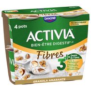 ACTIVIA Céréales Granola Amarante c'est l'alliance de l'onctuosité ACTIVIA et d'un mélange savoureux de délicieuses céréales. Véritable allié du petit-déjeuner et des fins de repas, cet Activia source de fibres est à base de bon lait et de 5 ferments dont des milliards de probiotiques*! .Une recette gourmande source de fibres qui contribue à votre apport quotidien recommandé en fibres**. *Activia contient les ferments du yaourt : les probiotiques. Ils vous aident à la digestion du lactose de votre Activia en cas de difficulté à le digérer ** Apport quotidien recommandé = 30g (ANSES 2016)