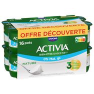 Activia nature 0% est une recette nature au bifidus à la texture ferme et fondante avec 0% de matière grasse. Cet Activia 0% est conçu dans note laiterie de Bailleul (59) et contient uniquement 3 ingrédients, 100% d'origine naturelle : du bon lait français*, 5 ferments dont des milliards de probiotiques**. Il est idéal au petit-déjeuner ou en fin de repas! *Ajout de lait écrémé concentré ou en poudre (Origine: UE) **Activia contient les ferments du yaourt : les probiotiques. Ils vous aident à la digestion du lactose de votre Activia en cas de difficulté à le digérer.