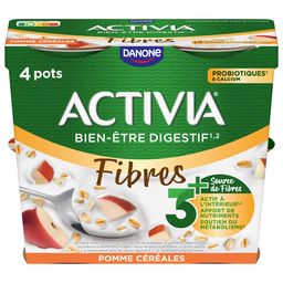 Activia Pomme Céréales, c'est une recette avec de délicieux morceaux de fruits mélangés à une texture gourmande aux céréales. Source de fibres et toujours avec des probiotiques qui contribuent à l'équilibre de votre flore intestinale.