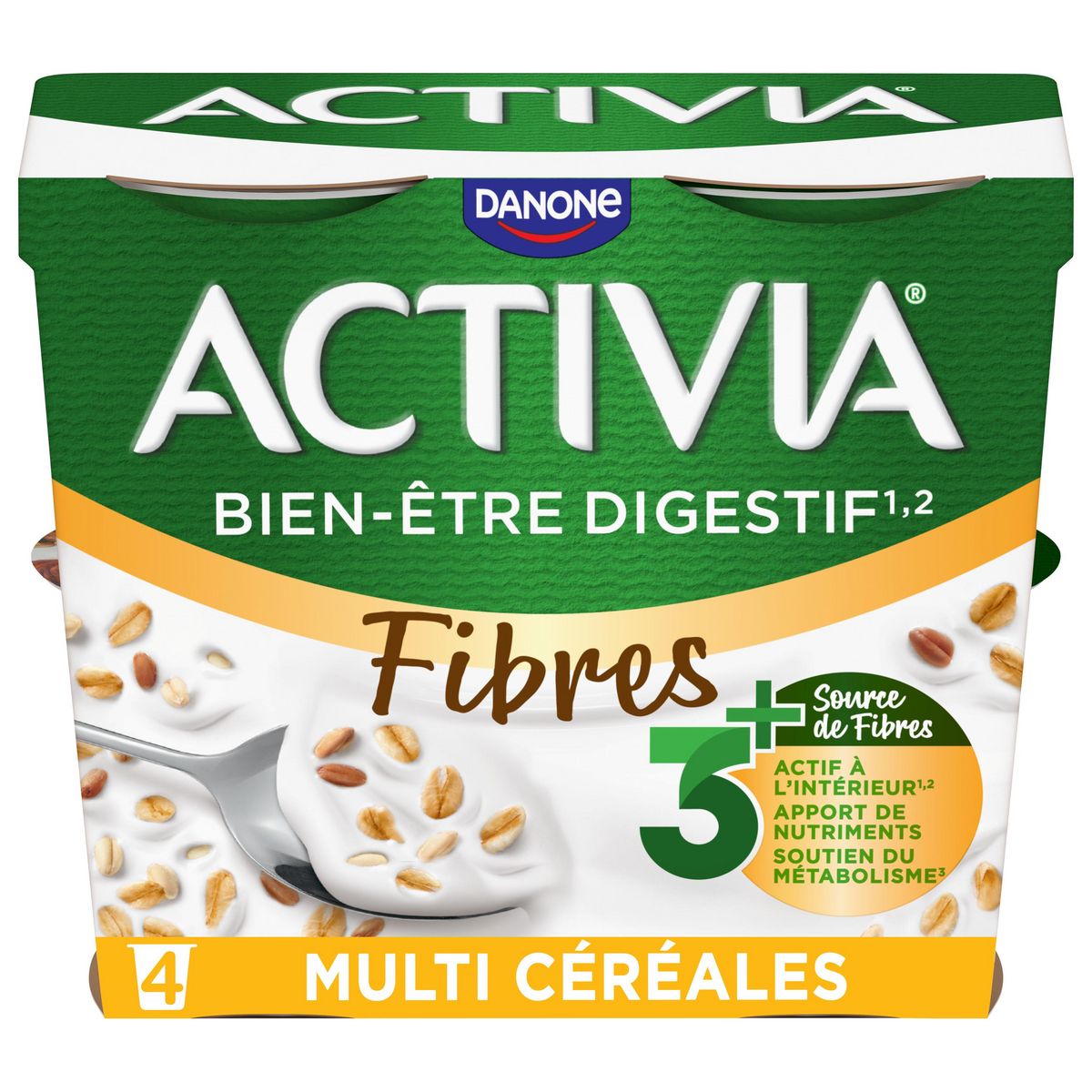 "ACTIVIA Multi Céréales, c'est l'alliance de l'onctuosité ACTIVIA et d'un mélange savoureux de muesli avec de délicieuses céréales. Véritable allié du petit-déjeuner et des fins de repas, cet Activia source de fibres est à base de bon lait et de 5 ferments dont des milliards de probiotiques*! .Une recette gourmande source de fibres qui contribue à votre apport quotidien recommandé en fibres**. *Activia contient les ferments du yaourt : les probiotiques. Ils vous aident à la digestion du lactose de votre Activia en cas de difficulté à le digérer ** Apport quotidien recommandé = 30g (ANSES 2016)"