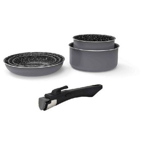 Batterie de cuisine 6 pièces effet pierre en aluminium. Poignée amovible. Composition : 3 poêles de 20 24 et 28 cm, 2 casseroles de 16 et 20 cm. Et une poignée.