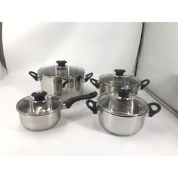 Batterie de cuisine en acier inoxydable 8 pièces, tous feux dont induction. Comprend 1 casserole 16 cm et 3 faitouts (18, 20, 24 cm) avec couvercles en verre. Poignées fixes en bakélite, revêtement intérieur inox.