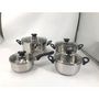 En savoir +Batterie de cuisine en acier inoxydable 8 pièces, tous feux dont induction. Comprend 1 casserole 16 cm et 3 faitouts (18, 20, 24 cm) avec couvercles en verre. Poignées fixes en bakélite, revêtement intérieur inox.