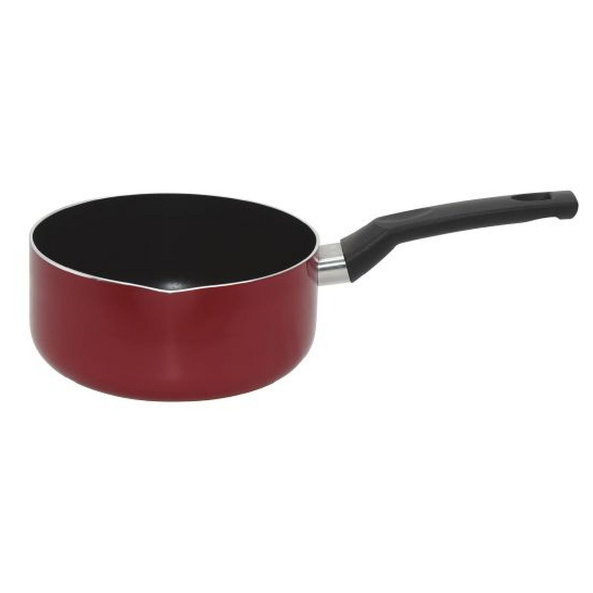 Casserole en aluminium rouge de 14 cm, compatible avec tous feux sauf induction. Revêtement antiadhésif, poignée fixe.
