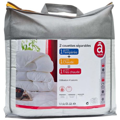 J'ai acheté cette couette en soldes. J'étais séduit par le concept de deux couettes clipsables, l'une plus légère que l'autre. Sur la matière du produit (microfibre polyester), rien à redire. Certes, c'est moins chaud que du duvet mais ce n'est pas le même prix non plus. Ce qui me chagrine, c'est ce système de boutons pression, apparemment judicieux mais qui s'avère au final une fausse bonne idée (ou alors, je suis tombé sur un mauvais exemplaire). Lesdits boutons sont en matière plastique de piètre qualité. Certains ne clipsent pas, d'autres se déclipsent au moindre mouvement. Bref, bien pensé mais mal exécuté. De ce fait, l'assemblage de la couette est assez fastidieux. Je ne comprends pas comment les concepteurs d'un tel produit ne le vérifient pas avant commercialisation. J'ai mis 3 étoiles mais ma note serait plutôt de 2,5. Si j'avais été à proximité d'un magasin Auchan, j'aurais fait un retour mais j'habite à presque 50 km du plus proche. J'ai donc laissé tombé l'affaire. Mais ça ne m'incite pas à acheter des produits de marques du groupe Auchan (marque Actuel)