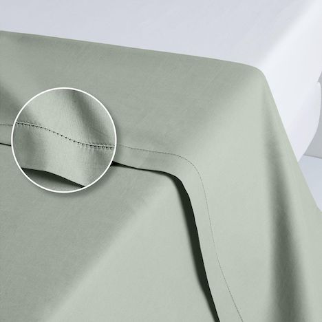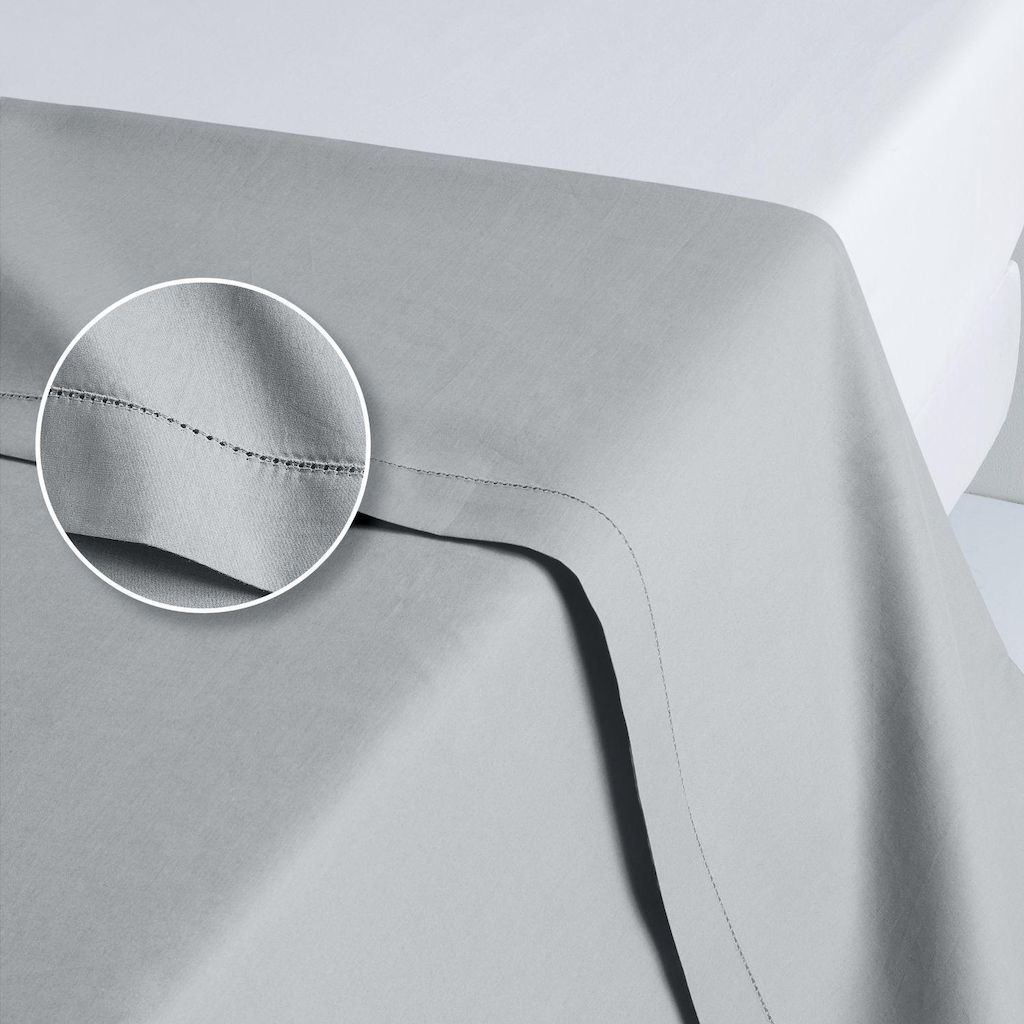 Drap plat unie en percale 100% coton, finition ajourée. Disponible en coloris gris ou vert amande et 2 tailles - S'associe aux draps et housse de couette de la même collection, en total look ou en mixant les couleurs, pour un lit pur bonheur !