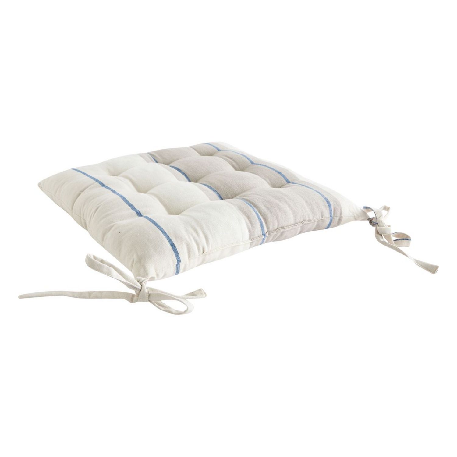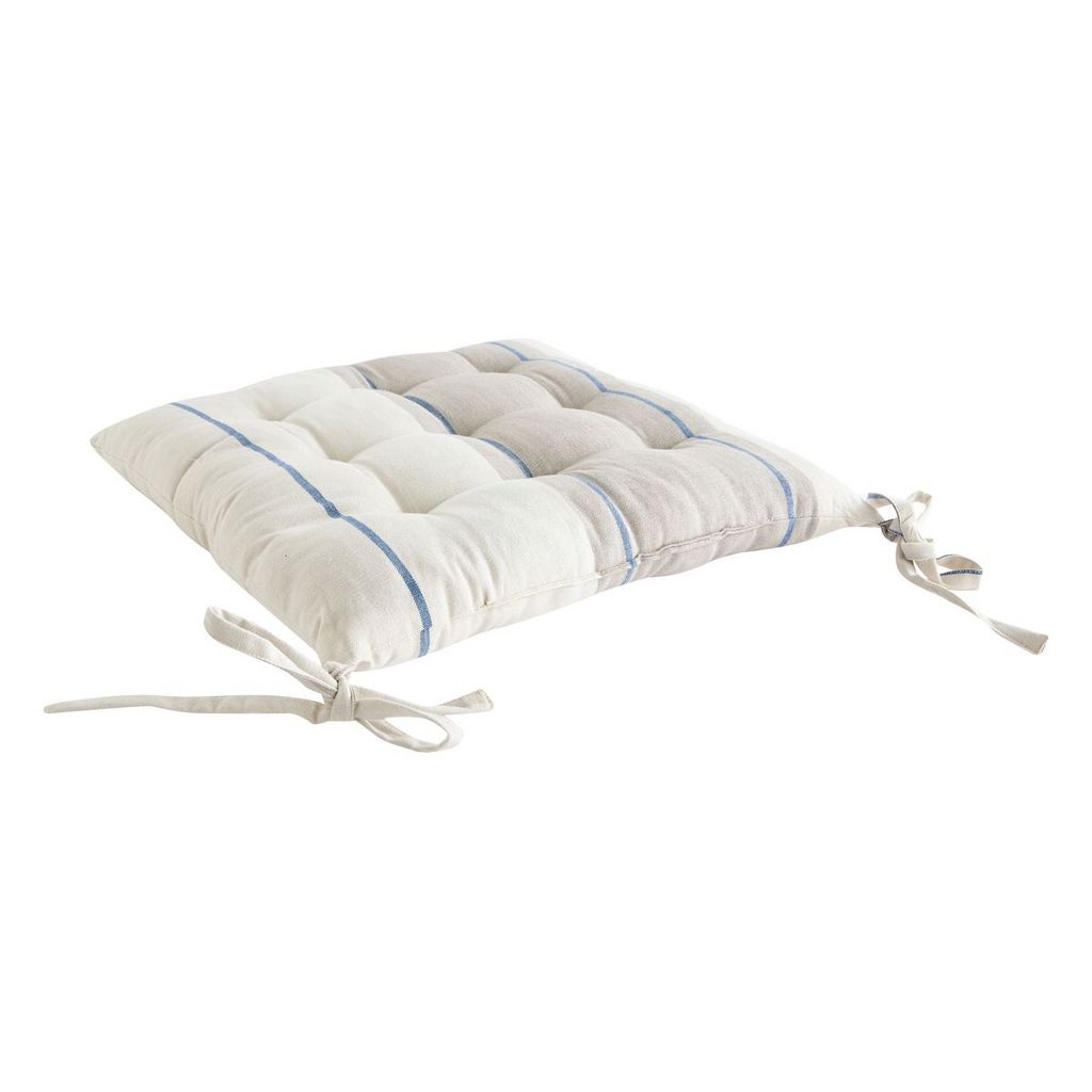 Un coussin de chaise revêtu d'un beau tissu blanc finement rayé de bleu... un esprit transat pour donner un petit air de vacances à votre coin repas ! Confortablement capitonnée, cette galette carrée vous offre aussi un confort très agréable tout en protégeant vos chaises. L'idée-déco ? Mixer ce cou