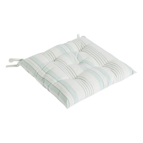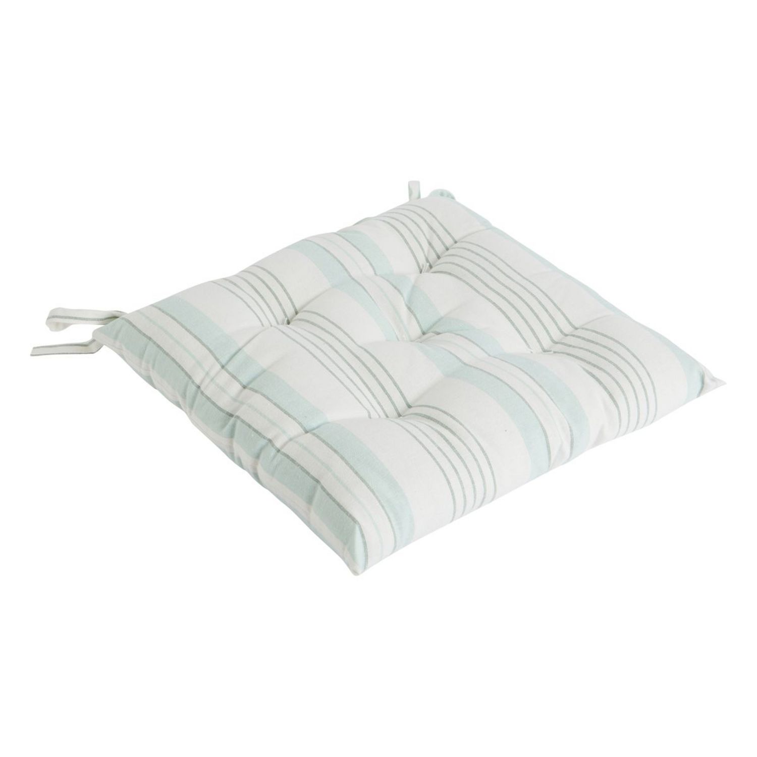 Galette de chaise à rayures matelassée en coton. Cette galette de chaise est à nouettes afin de l'accrocher à votre chaise facilement.