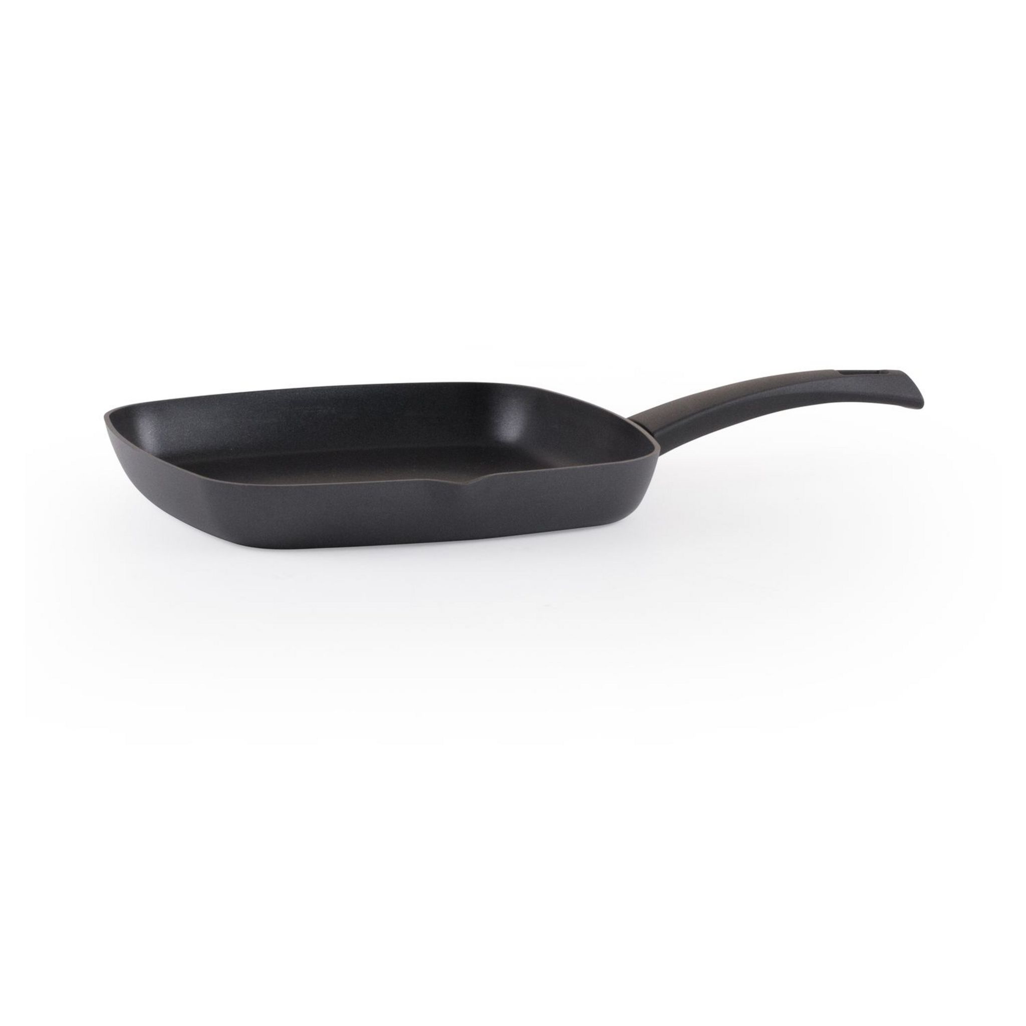 Poêle Grill induction recyclé 28x28 cm, couleur noir. Compatible avec tous feux dont induction. Revêtement antiadhésif pour une cuisson sans accroc. Fabriquée en aluminium 100% recyclé, avec poignée fixe.