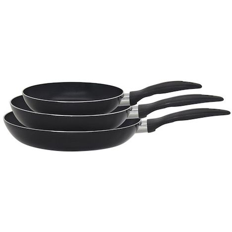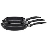 Lot de 3 poêles en aluminium de la marque ACTUEL. Compatible avec tous les feux dont l'induction. Diamètres : 20 24 et 28 cm.