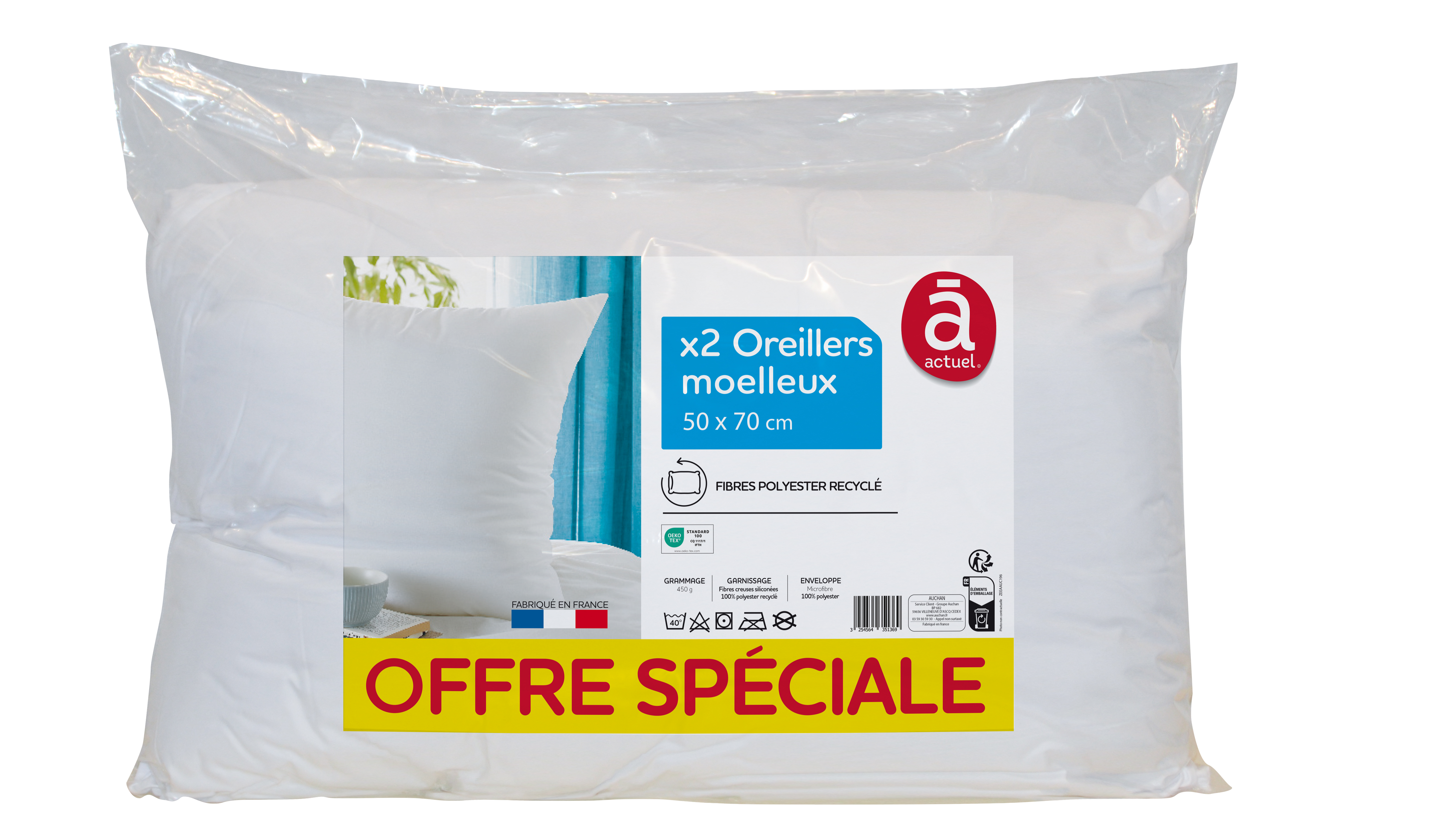 ENVELOPPE MICROFIBRE 100% POLYESTER - GARNISSAGE 100% POLYESTER SILICONE CREUX RECYCLE 450G/P - FINITION BOURDON APPARENT - SOUS SACHET + ENCART ACTUEL