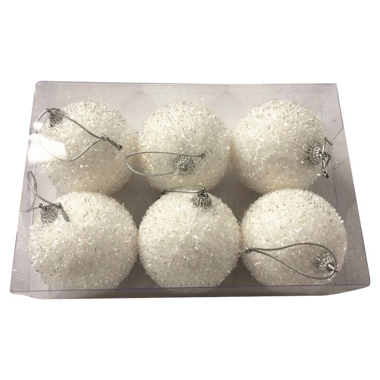 "Mettez une touche de fête avec ce lot de 6 boules neige. D'un diamètre de 8 cm et un joli coloris blanc, c'est un incontournable pour décorer votre sapin ou votre maison. "