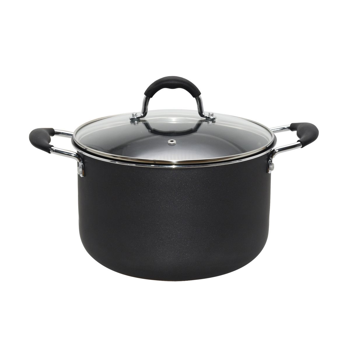 Marmite 26cm en aluminium noir et couvercle en verre. Poignées fixes pour un meilleur maintient de la marmite. Compatible au lave-vaisselle. Tous feux dont induction.