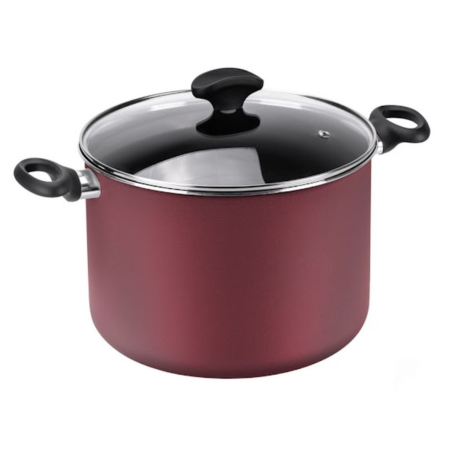 En savoir +Marmite en aluminium rouge de 24 cm, compatible avec tous feux sauf induction. Revêtement antiadhésif, couvercle rentrant, poignée fixe.