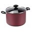 Marmite en aluminium rouge de 24 cm, compatible avec tous feux sauf induction. Revêtement antiadhésif, couvercle rentrant, poignée fixe.