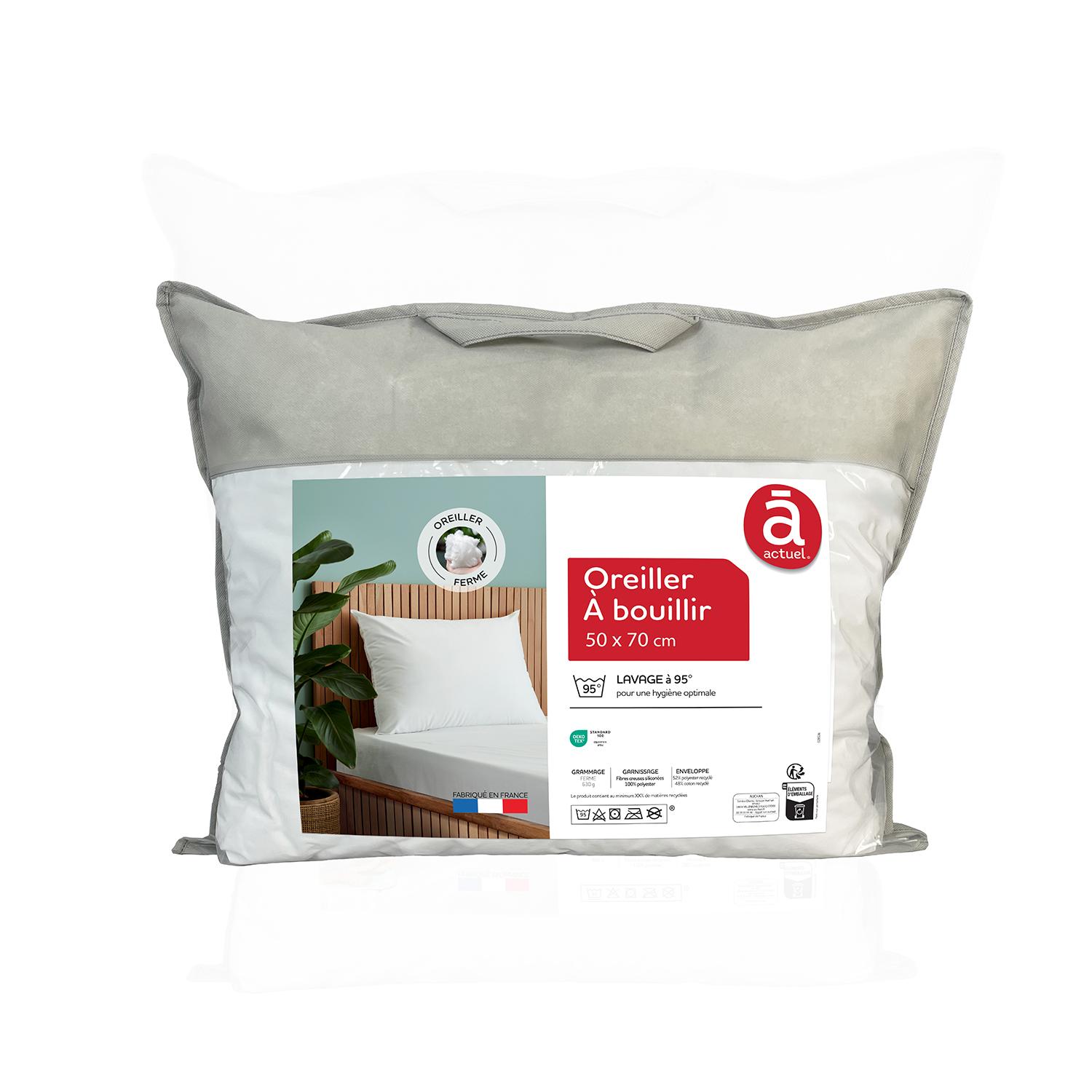 Oreiller ACTUEL Ferme A BOUILLIR - COLORIS : BLANC - ENVELOPPE : 52% POLYESTER RECYCLÉ - 48% COTON RECYCLÉ - GARNISSAGE : 100% POLYESTER - FIBRE CREUSE SILICONÉE CERTIFIÉE GRS - POIDS DE GARNISSAGE : 630 G - TAILLE : FINIE ET NON COUPÉE FINITION COUTURES INTÉRIEURES + FERMETURE SURJETÉE EMBALLAGE : HOUSSE « ACTUEL » PEVA/INTISSÉ DE COLORIS GRIS À POIGNÉE AVEC ZIP + 1 ENCART