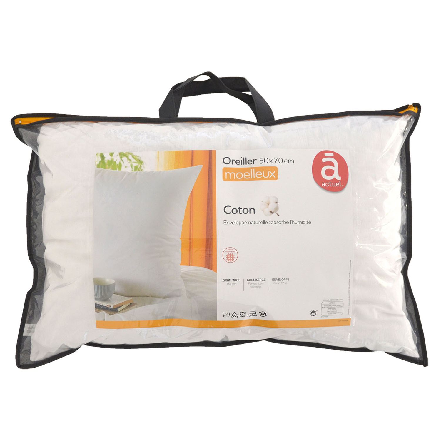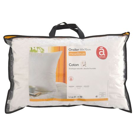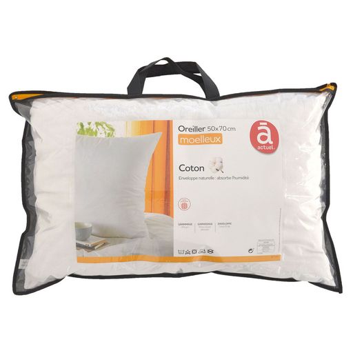 Oreiller au confort moelleux en coton 57 fils. Son enveloppe en fibre naturelle absorbe l'humidité. Fabrication française, qualité garantie. Existe en deux formats : carré ou rectangulaire.
