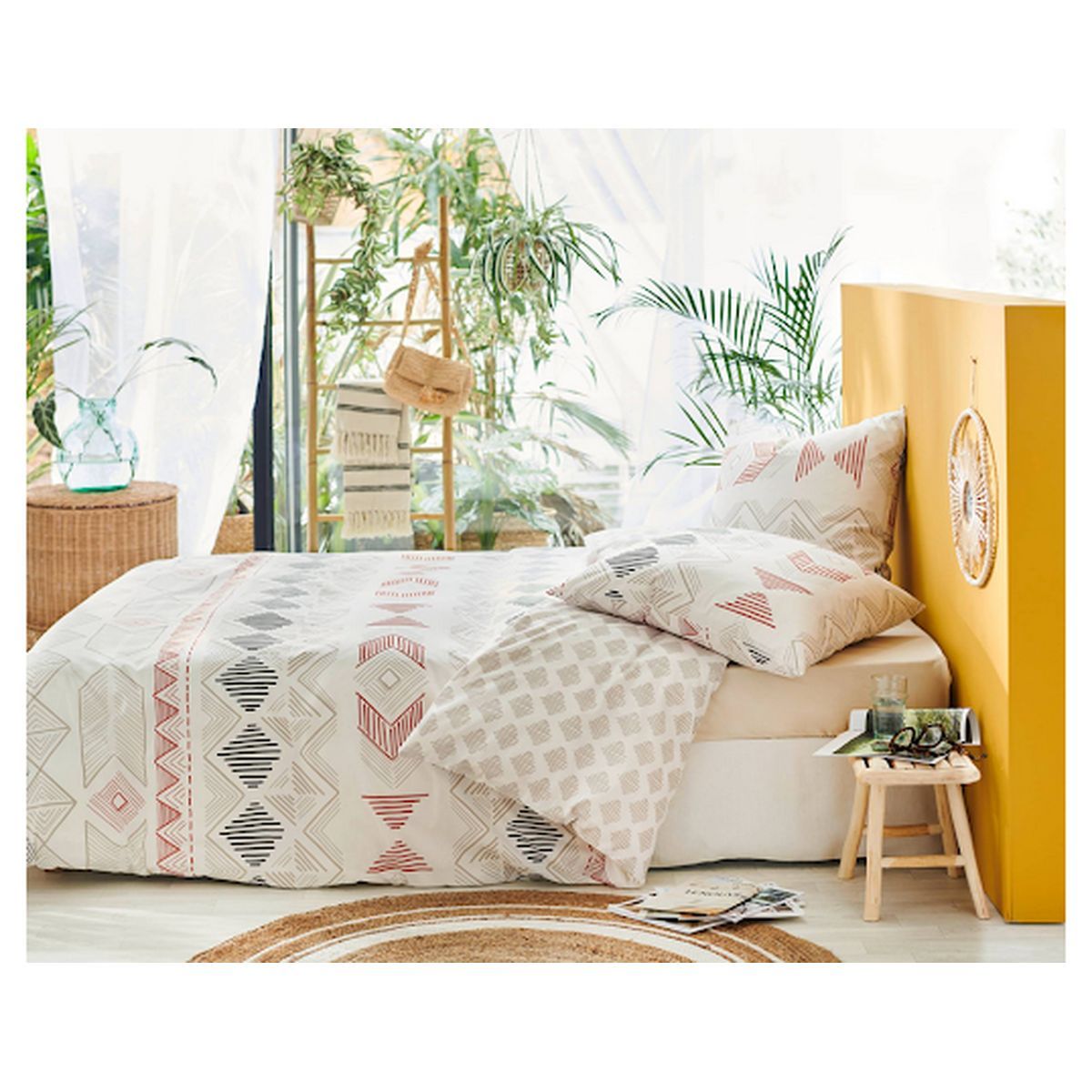 Parure housse de couette 1 ou 2 personne(s) + taie(s) d'oreiller en toile pur coton. Un superbe motif ethnique, des couleurs neutres pimentées d'une touche de rouge... un linge de lit ultra déco qui fait souffler un vent d'ailleurs dans la chambre. On adore sa belle simplicité doublée d'un côté réso
