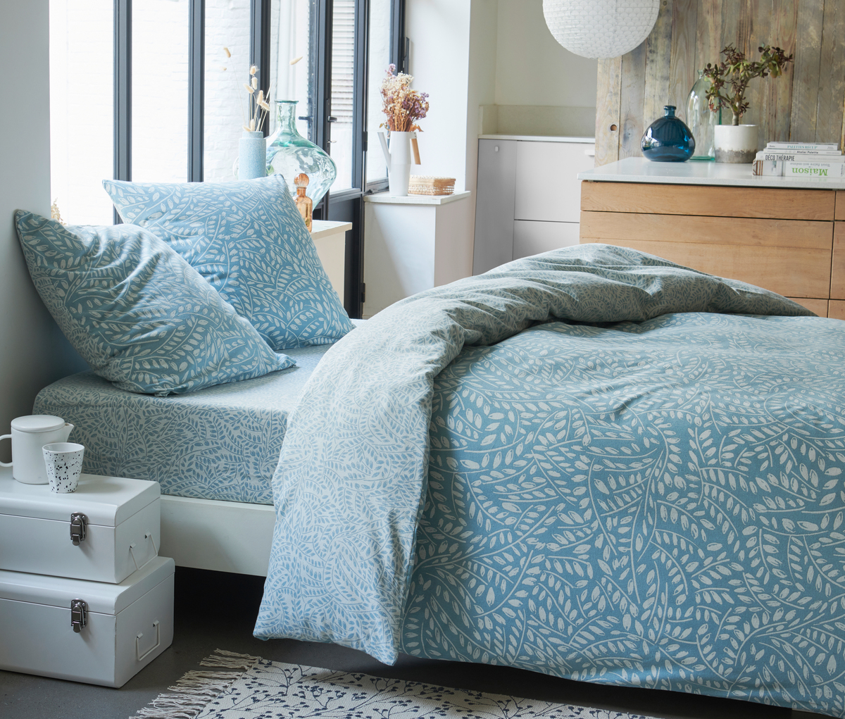 Une parure housse de couette + taies d'oreiller en flanelle pur coton douce et chaude... un bonheur pour les nuits d'hiver ! On craque aussi pour son ravissant motif feuillage, réversible en positif/négatif pour multiplier les plaisirs ! Un linge de lit à s'offrir dès aujourd'hui avec le drap-housse assorti pour affronter l'hiver en douceur. Housse de couette à base droite.