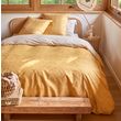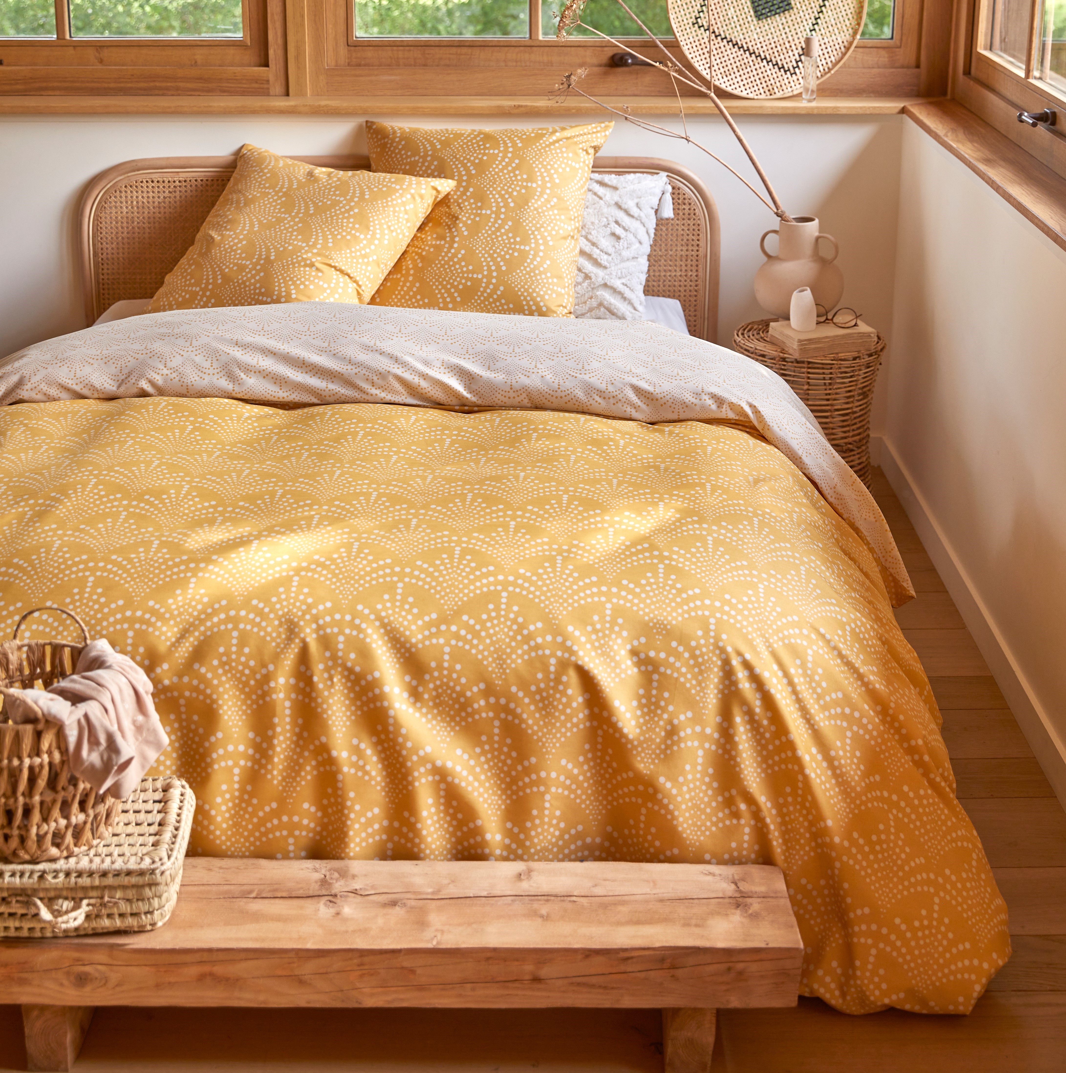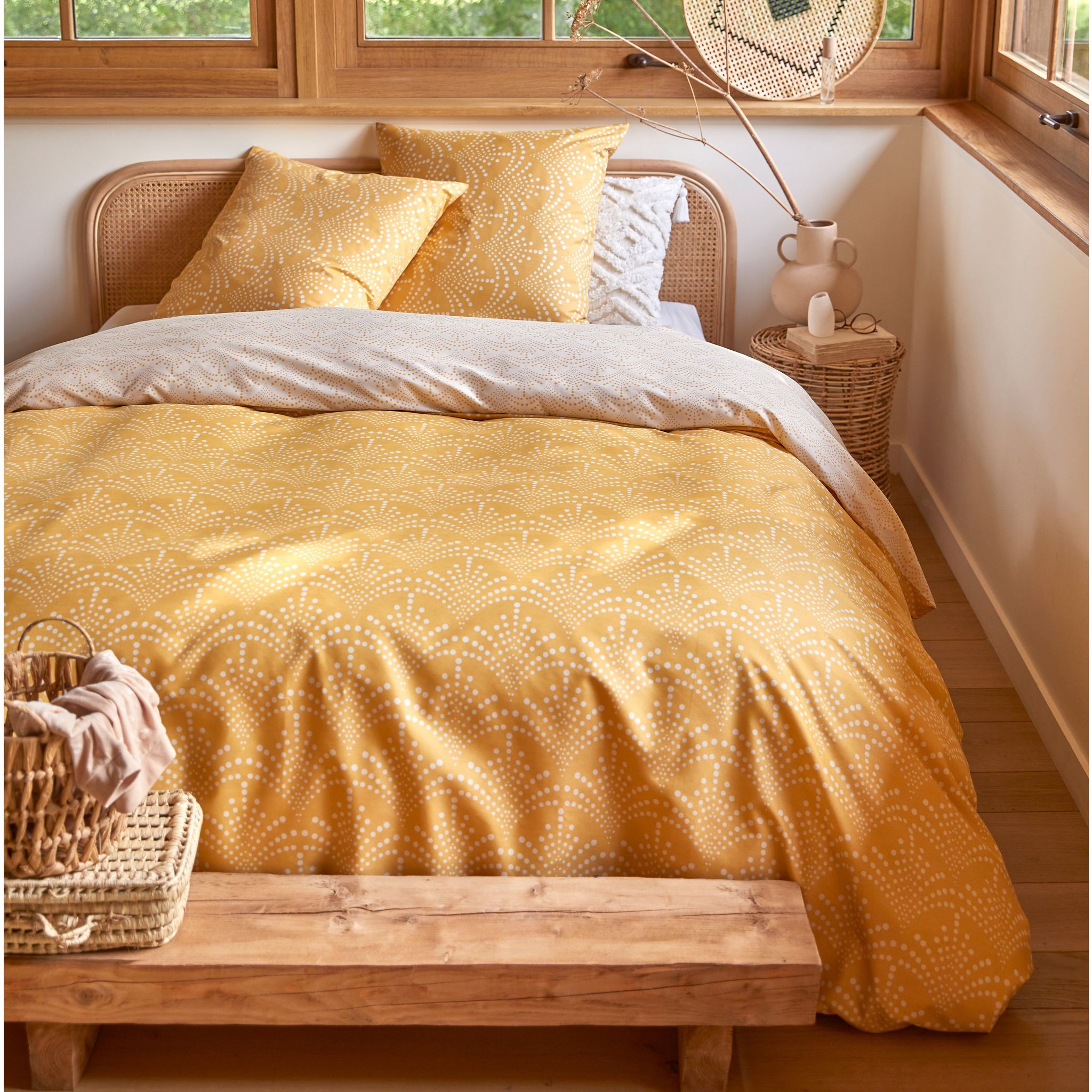 Parure housse de couette 1 ou 2 personne(s) + taie(s) d'oreiller en microfibre. Charme et élégance du motif Art Déco sur un fond jaune lumineux et très tendance, raffinement du verso de la housse de couette imprimé du même motif en version "small" sur fond ivoire... un linge de lit qui apporte un vrai "plus déco". Côté matière, une microfibre douce, légère et très confortable car respirante, qui sèche en un clin d'oeil et ne se repasse pas... le rêve ! Housse de couette à base droite boutonnée