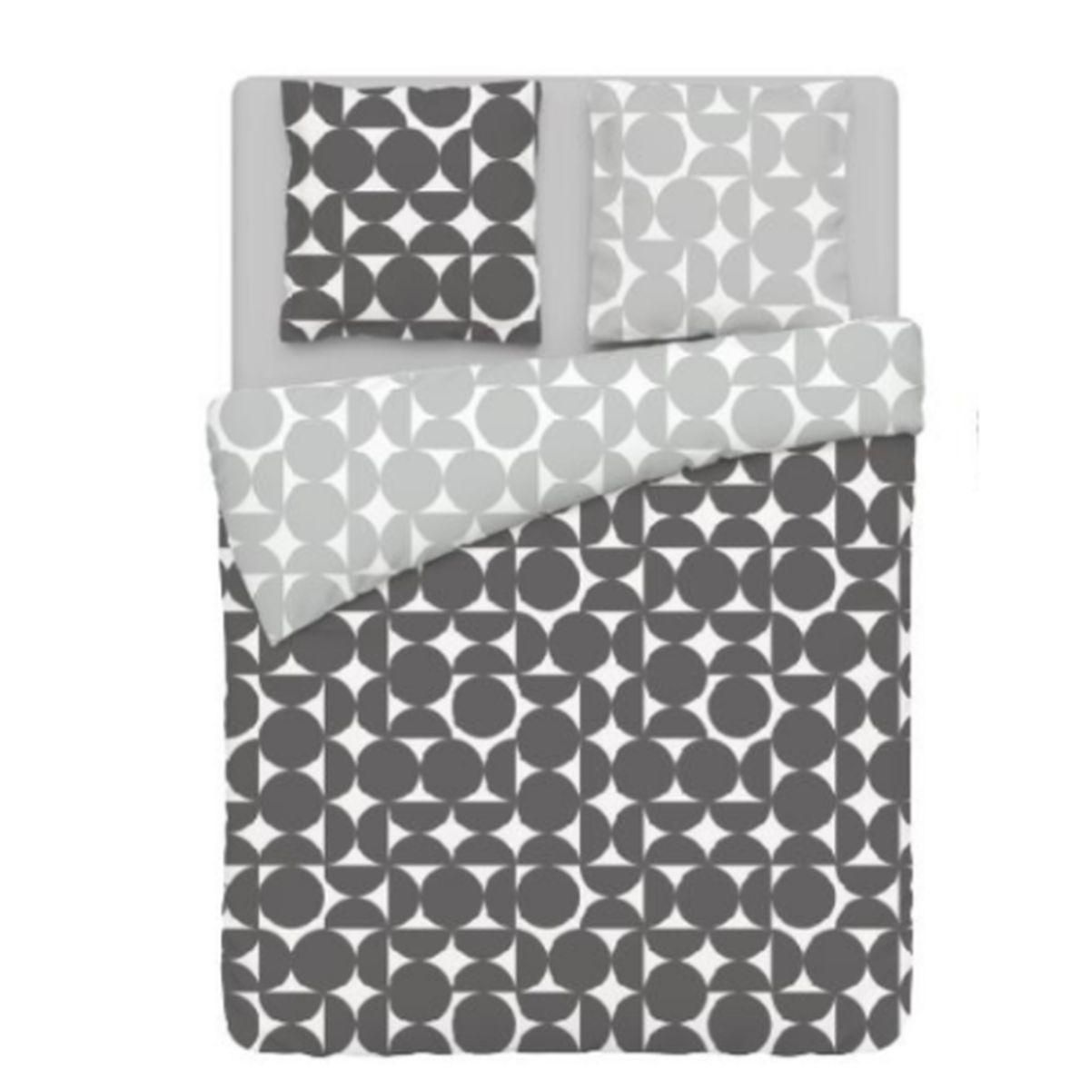 Parure housse de couette 1 ou 2 personne(s) + taie(s) d'oreiller en toile polyester/coton douce au toucher. Un linge de lit réversible pour jouer avec les associations, un motif "pastilles" ludique et déco... une parure très contemporaine qui donne une belle personnalité à la chambre. Côté matière, c'est une toile douce au toucher qui sèche vite et ne demande qu'un léger repassage... tout pour nous simplifier la vie !