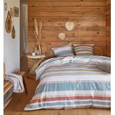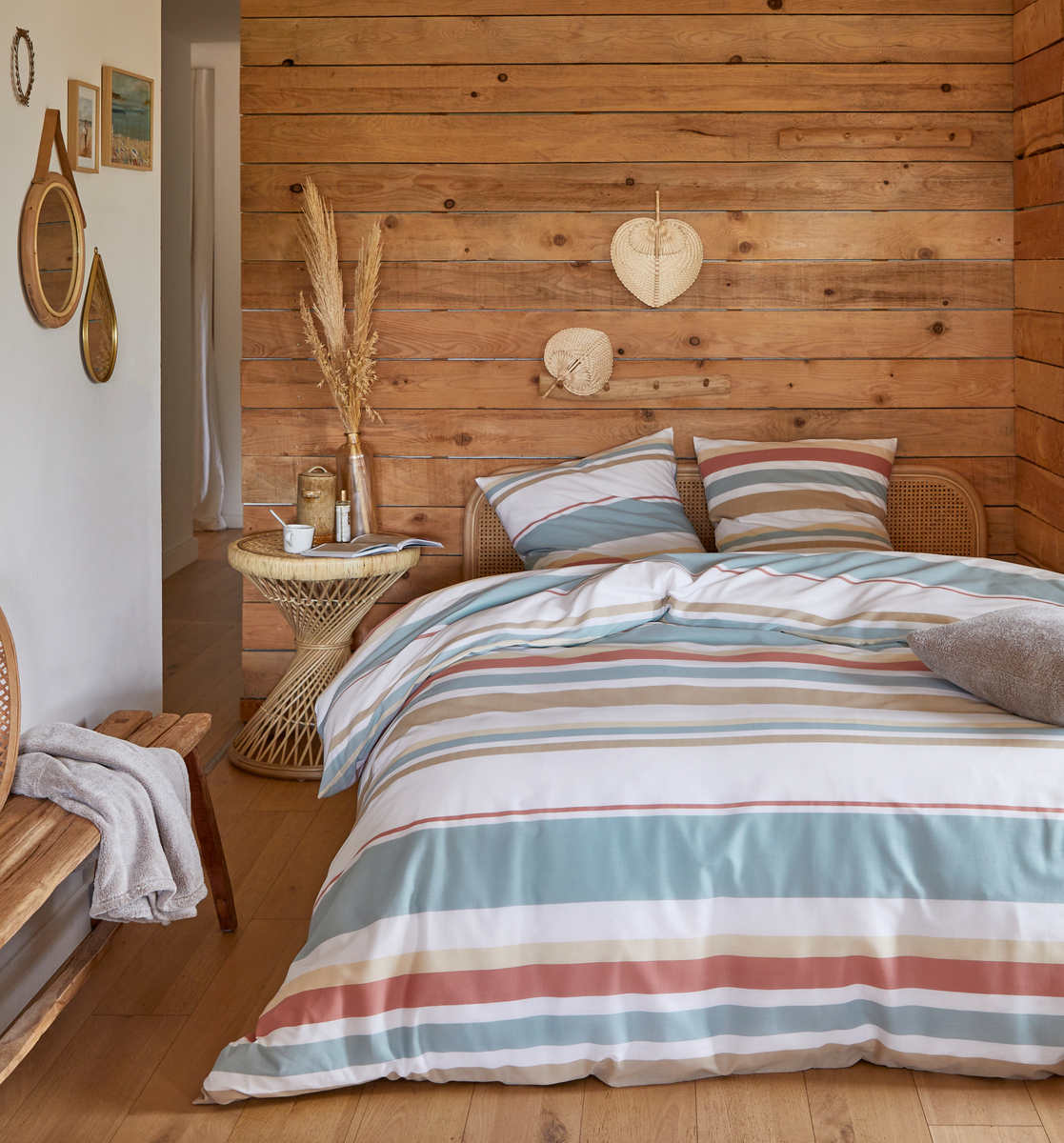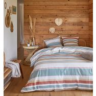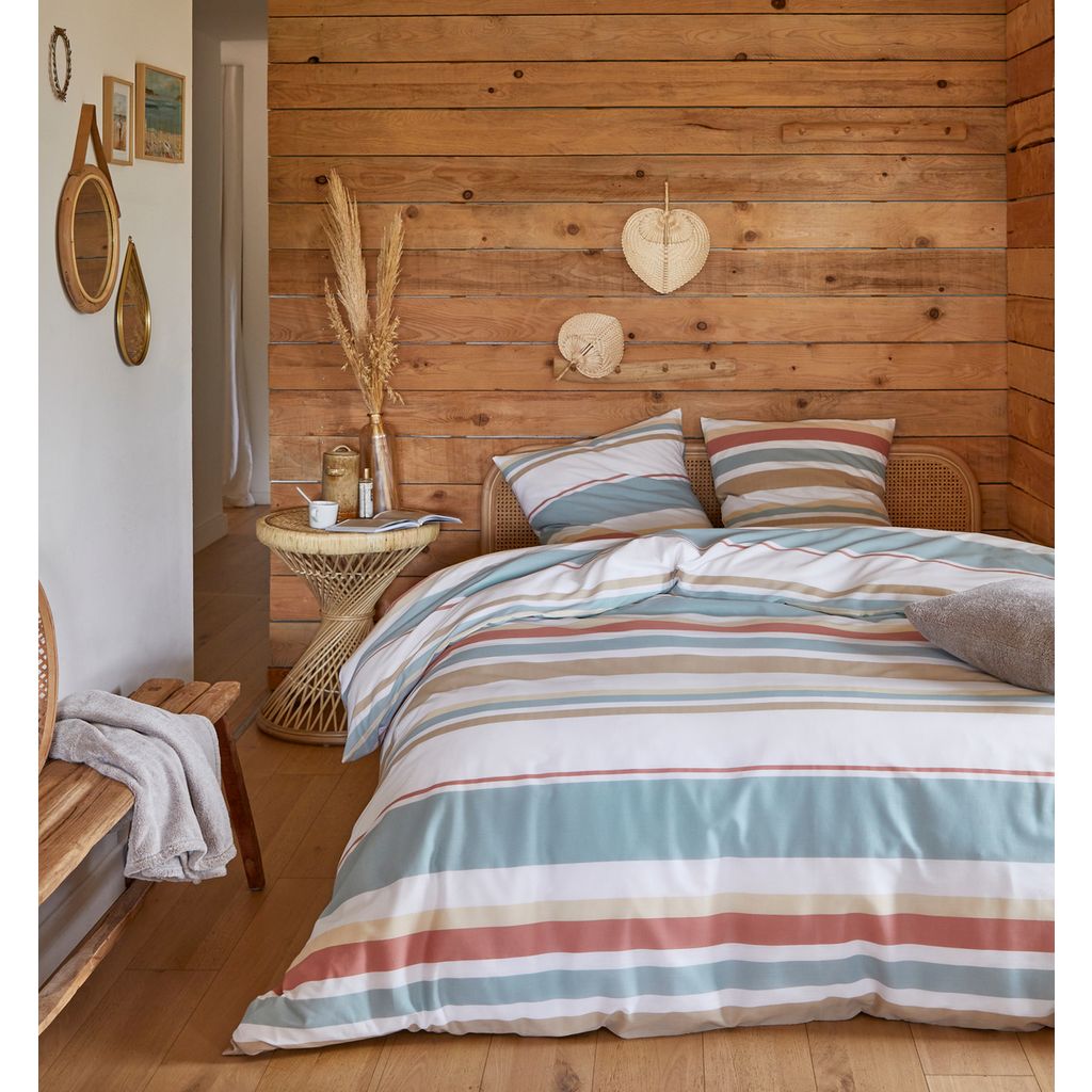 Parure housse de couette 1 ou 2 personne(s) + taie() d'oreiller en toile polyester/coton recyclé. Des bouteilles en plastique recyclées en polyester, des vêtements usagés recyclés en coton... c'est bon pour la planète et on dit OUI ! On craque aussi pour ces rayures intemporelles aux couleurs toniques dont on ne se lasse pas ! Housse de couette à base droite. Entretien facile (séchage rapide, repassage léger).