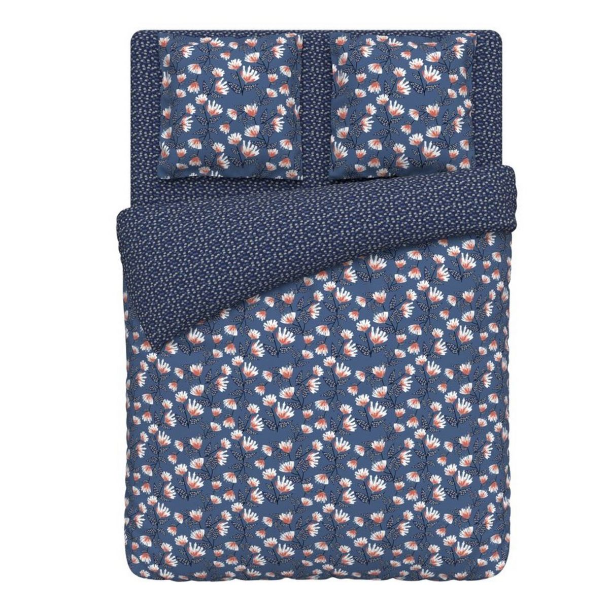 Parure housse de couette 1 ou 2 personne(s) + taie() d'oreiller en toile polyester/coton douce au toucher. Ravissant motif d'esprit japonisant, joli verso à laisser apparent, bleu nuit intense ultra-séduisant, un linge de lit 100% déco qui conjugue en beauté charme et modernité. A s'offrir avec le drap-housse coordonné pour que le plaisir soit complet ! Côté entretien, un séchage rapide, un repassage léger, et le tour est joué ! Housse de couette à base droite boutonnée.