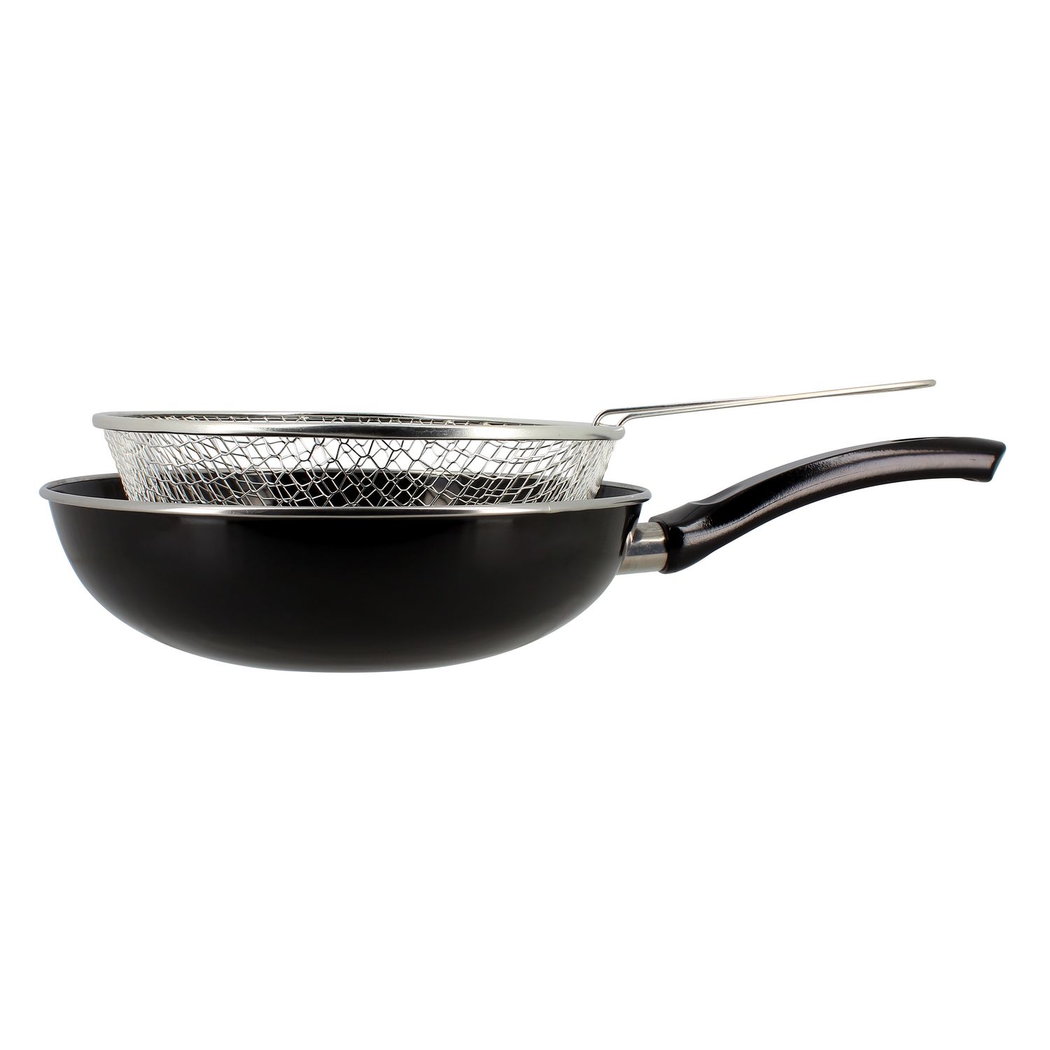 Poêle à frire noire avec revêtement intérieur en émail. Compatible avec tous les feux, y compris l'induction. Poignée fixe. D'une épaisseur de 0,6 mm, cette poêle à frire offre un excellent rapport qualité-prix. Elle est munie d'un panier en inox et garantie contact alimentaire, idéale pour frire vo