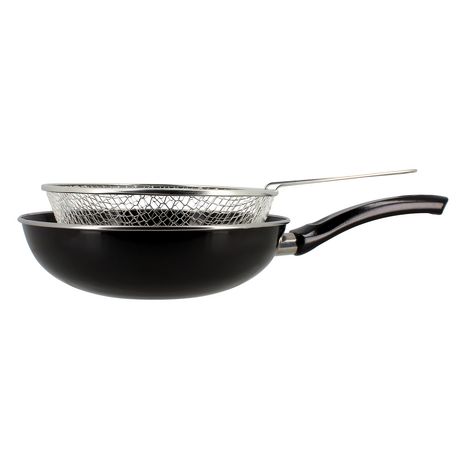 Poêle à frire noire avec revêtement intérieur en émail. Compatible avec tous les feux, y compris l'induction. Poignée fixe. D'une épaisseur de 0,6 mm, cette poêle à frire offre un excellent rapport qualité-prix. Elle est munie d'un panier en inox et garantie contact alimentaire, idéale pour frire vos aliments préférés.