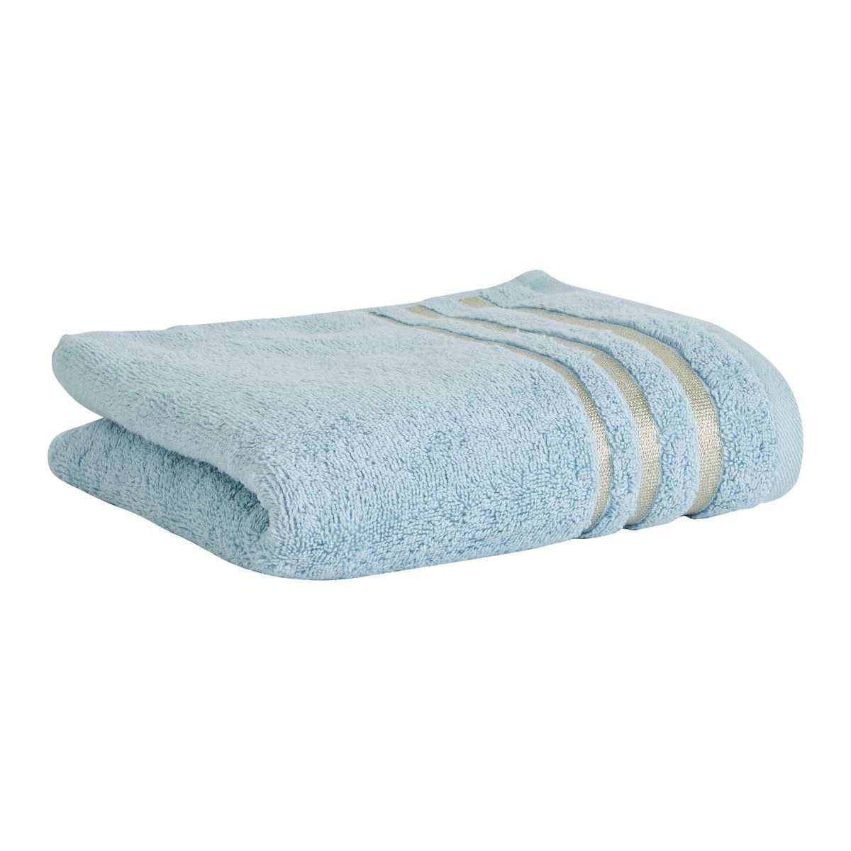 Serviette unie en coton liteau 500 g/m² SANDY ultra douce, absorbante et moelleuse. Son liteau doré à 3 bandes en lurex apporte une petite touche de fantaisie ! Serviette à assortir avec les gants de toilette et les draps de bain de la même collection.