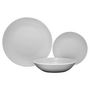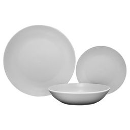 Set de 18 pièces d'assiettes rondes en grès, couleur gris. Compatible avec lave-vaisselle et micro-ondes.