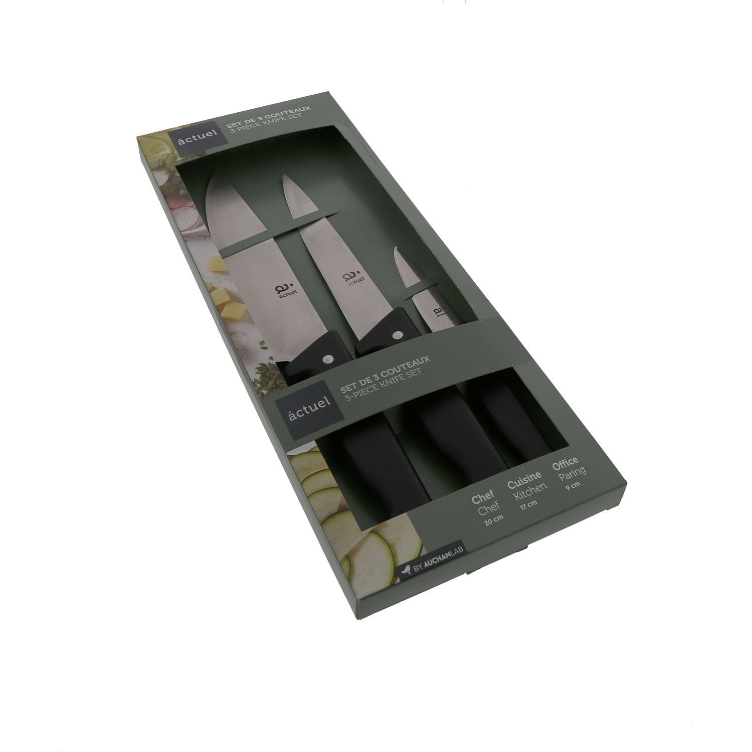 Set de 3 couteaux: 1 office lame 9cm, 1couteau de cuisine lame 17 cm et 1 couteau du chef lame 20 cm en acier inoxydable et manche en Polypro. Fabriqué en France et compatible lave-vaisselle.