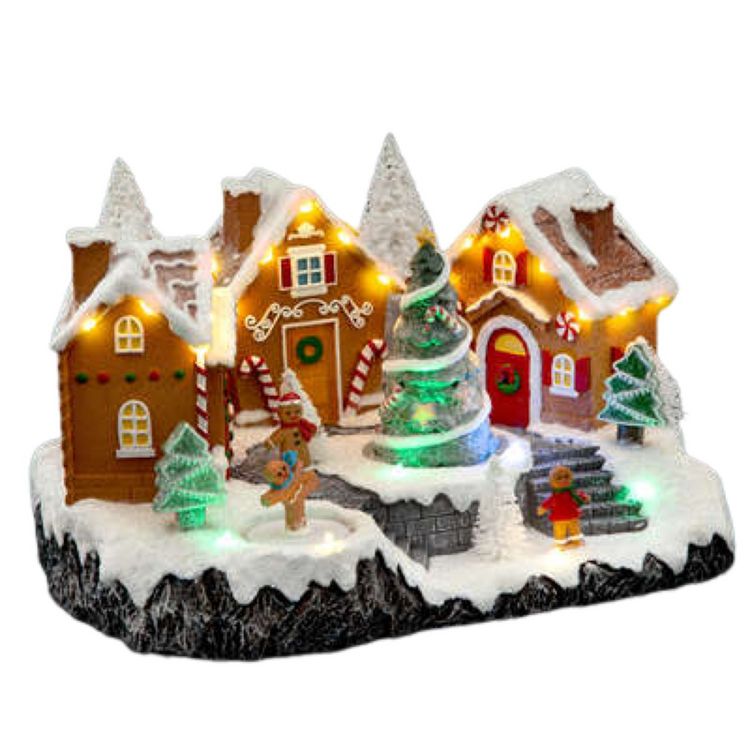 Informations Techniques : Dimensions : L. 31 x l. 23 x H. 18 cm Matière : Polyrésine Spécificités : Déco & Festif Village de Noël à poser Design pain d'épice Fonctions : lumineuse, mouvement et musicale Éclairage : 25 LED Multicolore Poids : 2,2 kg Couleur : Multicolore