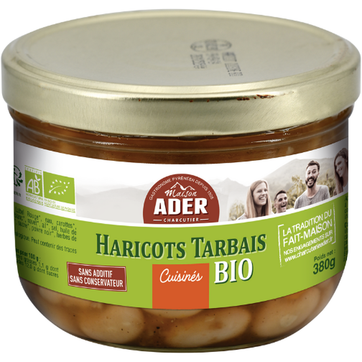 Haricots tarbais Label Rouge*, eau, carottes*, oignons*, tomates*, CELERI, vin blanc*, navet*, ail*, sel, huile de tournesol*, concentré de tomate*, sucre*, poivre noir*, herbes de provence*, laurier*.