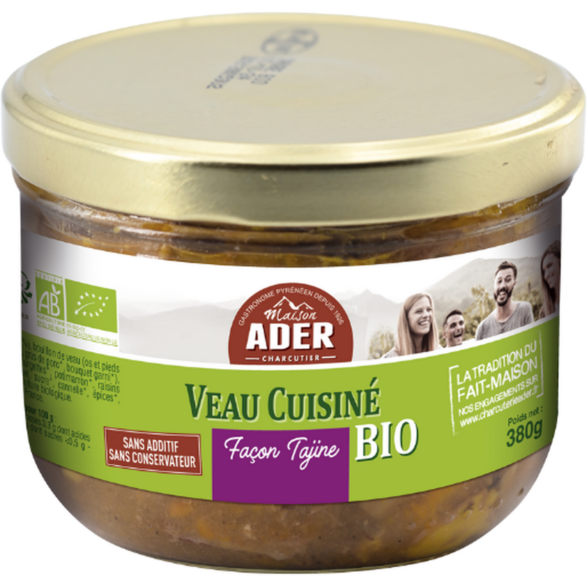 Viande de veau*(24,7%) , bouillon de veau (os et pieds de veau*, eau, carottes*, oignons*, gras de porc*, bouquet garni*), tomates*, oignons*, carottes*, cougettes*, potimarron*, raisins secs*, abricots secs*, navets*, sel, sucre*, cannelle*, épices*, poivre*). *Produits issus de l'agriculture biologique.