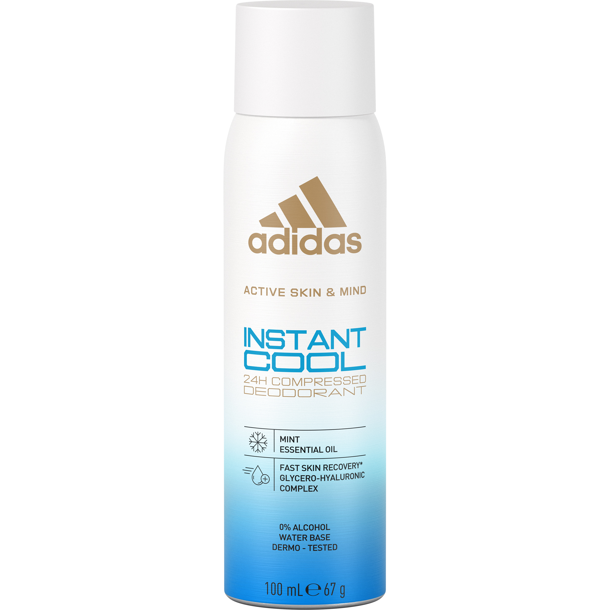 LE SPRAY DÉODORANT ADIDAS COMPRESSÉ ACTIVE SKIN & MIND INSTANT COOL EST COMPOSÉ D'HUILE ESSENTIELLE DE MENTHE QUI PROTÈGE CONTRE LES ODEURS PENDANT 24 H ET D’UN COMPLEXE GLYCÉRO-HYALURONIQUE POUR UNE RÉCUPÉRATION RAPIDE DE L'HYDRATATION DE LA PEAU. LA FORMULE DU DÉODORANT EST SANS ALUMINIUM, SANS ALCOOL ET À BASE D’EAU. LE DÉODORANT PEUT S’APPLIQUER SUR PLUSIEURS ZONES : LES AISSELLES, LE COU, LES POIGNETS ET LA POITRINE.