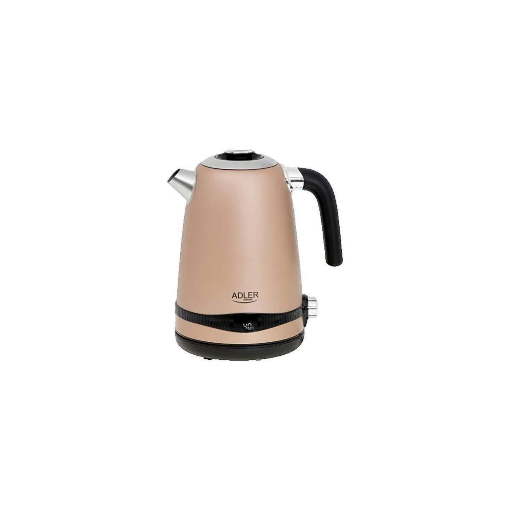 Découvrez la bouilloire électrique Adler AD 1295, idéale pour la cuisine. Dotée d'un design vintage avec des accents cuivre, elle offre une capacité de 1,7 litre et une puissance de 2200 W. Elle dispose d'un écran LCD, d'un contrôle de température réglable de 40 à 100 °C, et d'une fonction maintien