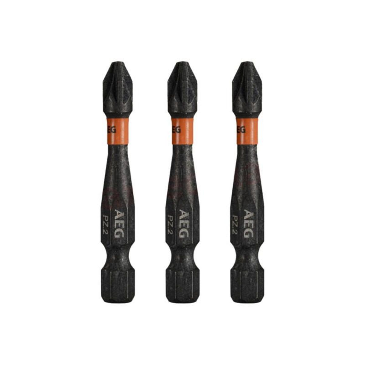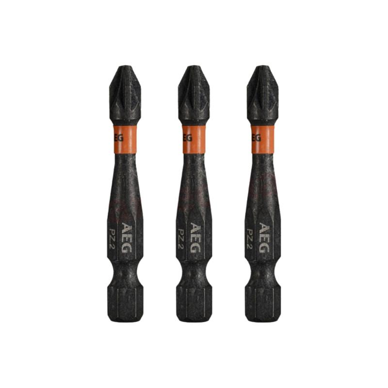 Embouts de vissage balistiques améliorés AEG - 50 mm - 3 pcs - PZ2, conçus pour fonctionner avec impact lors du montage et du démontage des fixations. En raison de la zone de torsion à couple élevé, la transmission de force est réduite, ce qui se traduit par une longue durée de vie.