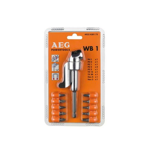 Renvoi d'angle WB1 et 10 embouts de vissage AEG 4932430173, un outil idéal pour travailler dans des espaces confinés, convient à toutes les machines.