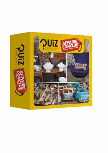 Tout le monde a quelque chose à vendre : et vous, saurez-vous répondre tous les jours aux questions du quizz Affaire Conclue ? Meilleures estimations, plus grosses ventes et plus belles pièces insoupçonnées : dévoilez chaque jour une nouvelle question et devenez incollable sur les trésors cachés des greniers ! 365 questions Affaire Conclue pour bien commencer la journée tout au long de l'année !