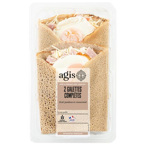Galette 50% (farine de sarrasin 27% (farine issue de moulins bretons à partir de sarrasin origine France), eau, sel de Guérande), OEUF sur le plat 23%, jambon cuit choix 8,2% (jambon de porc, eau, sel, dextrose, bouillon (blettes, acérola, carottes), arôme naturel, ferments), eau, EMMENTAL 3,3%, MOZZARELLA, CREME (dont stabilisant : carraghénanes), amidon de maïs, extrait d'oignon, sel. Traces éventuelles de blé. Élaboré à partir de viande de porc origine France. Ne pas congeler