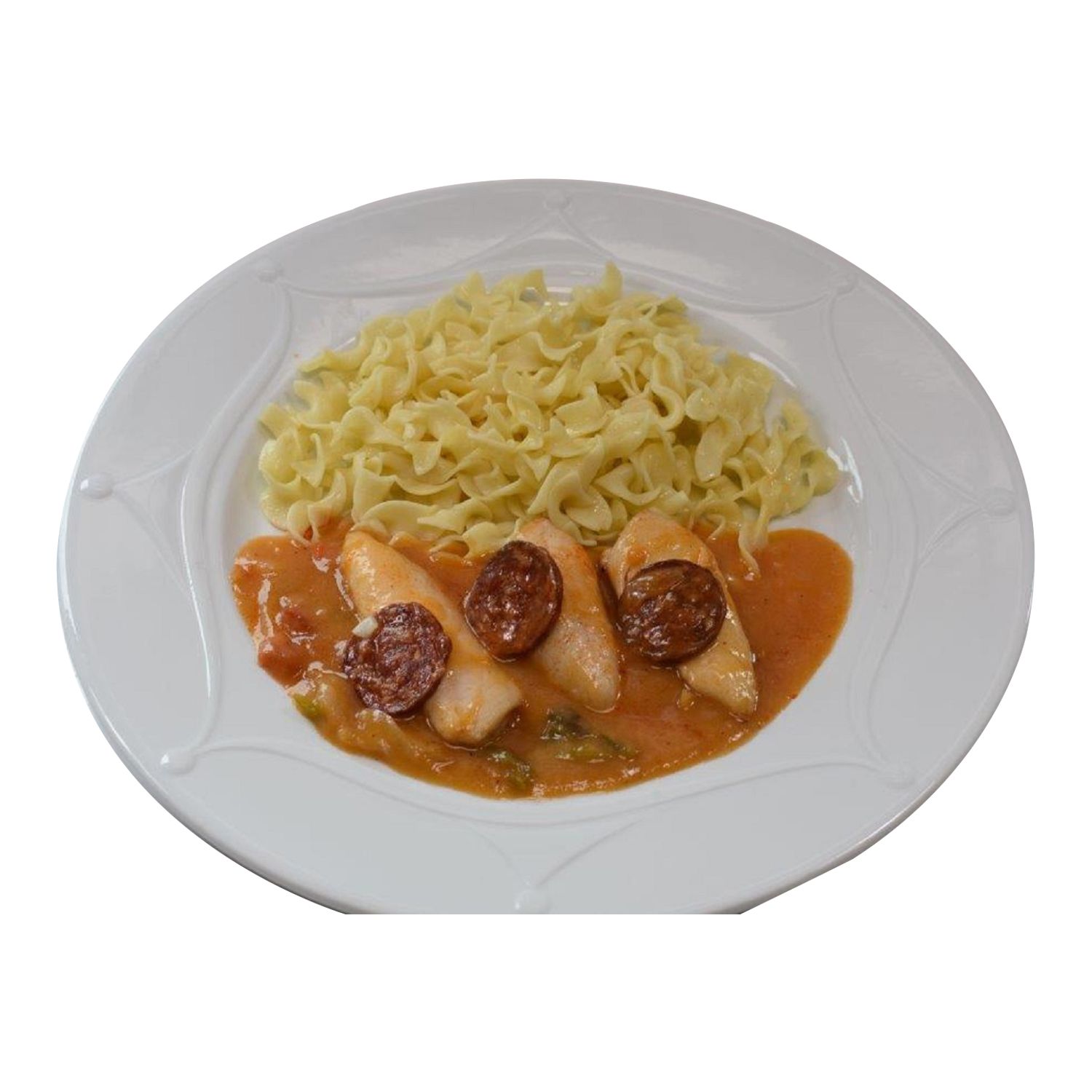 Ingrédients : Eau, aiguillettes de poulet rôties et cuites 25,0% [aiguillette de poulet 24,0% (Origine Hors UE), sirop de glucose, dextrose, amidon de tapioca, sel] ou [aiguillette de poulet 24,0% (Origine Hors UE), dextrose et amidon de tapioca, sel], nouilles 12,6% [semoule de BLE dur (Origine France), poudre de blanc d'OEUF plein air (Origine France)], oignon 6,2% (Origine UE), poivron rouge 3,8% (Origine UE), poivron vert 3,8% (Origine UE), chorizo pur porc 3,0% [viande de porc et gras de porc (Origine France), piments, sel, dextrose, ail, origan, extrait d’épice, ferments], huile d'olive, farine de BLE, vin blanc, tomate pelée concassée au jus 0,9% [tomate 0,6% (Origine UE), jus de tomate 0,3% (Origine UE), acidifiant : acide citrique, affermissant : chlorure de calcium], huile de colza, sel, gélatine de bœuf, tomate en poudre, sucre, sauce piment Tabasco® (vinaigre d'alcool, piment rouge, sel), arômes naturels ail, thym et laurier, poivre. Traces éventuelles de lait, soja, céleri, poisson, crustacés, mollusques, moutarde, graines de sésame, fruits à coque et arachides.