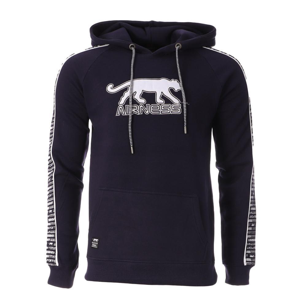 Optez pour ce sweat de la marque AIRNESS ! Coloris : marine Manches longues Avec capuche et cordon de serrage Composition : 60% Coton, 40% Polyester Logo Airness à l'avant Intérieur doux et molletonné 2 bandes blanches sur le côté