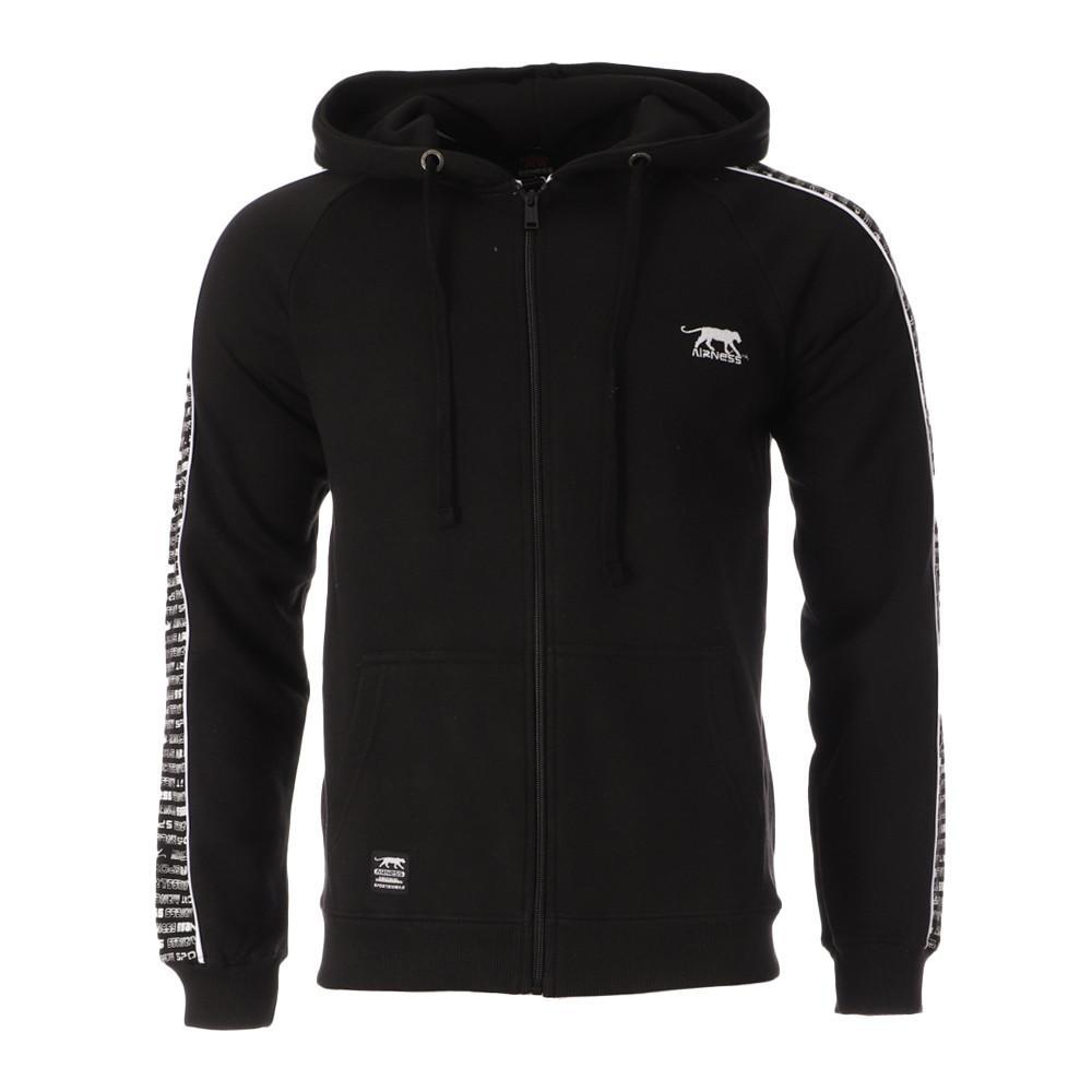 Optez pour ce sweat zippé de la marque Airness ! Coloris : noir Cordon de serrage à la capuche Manches longues Composition : 60% coton, 40% polyester Bandes imprimées sur les manches Poches à l'avant