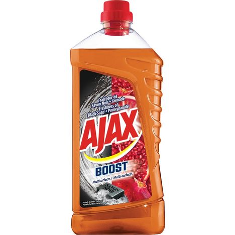 Découvrez Ajax Boost au Savon Noir et Fraîcheur Grenade Ce nettoyant ménager liquide pour sols et multi-surfaces offre une action ultra-dégraissante, une propreté sans traces et une fraîcheur intense.