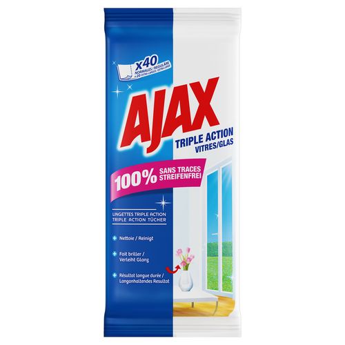 Découvrez les lingettes Ajax Triple Action 100% sans traces. Des lingettes qui nettoient et font briller les vitres, pour un résultat longue durée.