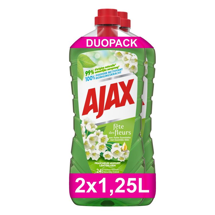 Faites briller votre maison avec le nettoyant tout usage Ajax Fête des Fleurs Fraîcheur Muguet. Ce nettoyant multi-usages au parfum longue durée plus intense, a une formule composée à 99% d'ingrédients d'origine naturelle. Et la bouteille est faite à partir de plastique 100% recyclé.