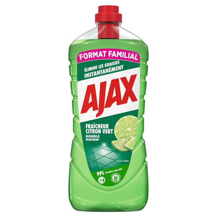 Le nettoyant multi-surfaces Ajax Citron Vert offre un pouvoir 100% nettoyant et s'attaque instantanément à la saleté. Il est doté d'une technologie double fraîcheur qui libère 2 vagues de fraîcheur.