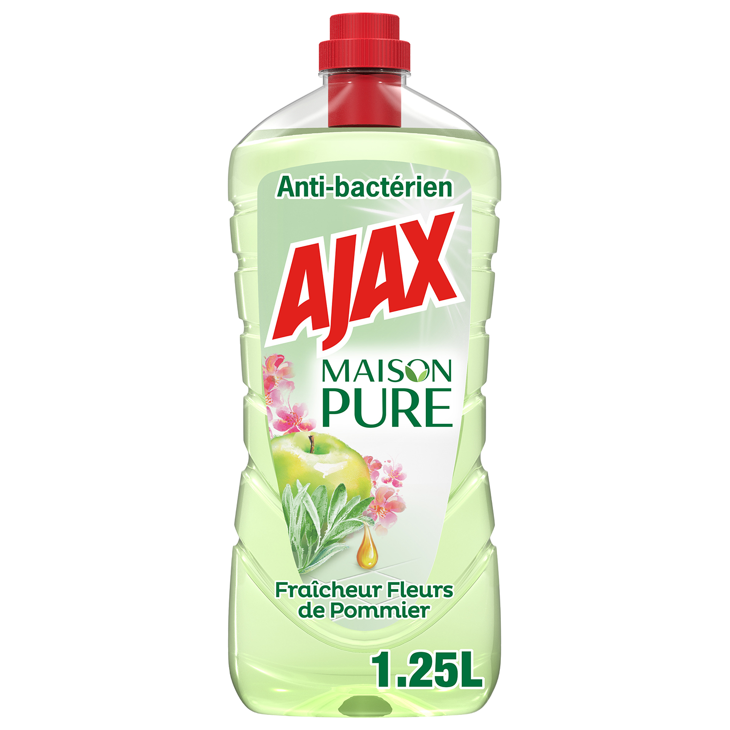 Ajax Maison Pure Désinfectant Fleurs de Pommier 1,25L Découvrez l'antibactérien Ajax Maison Pure à la Sauge et Fleurs de Pommier Ce désinfectant, élimine 99,99% des bactéries et laisse une hygiène et une fraîcheur longue durée d'herbes aromatiques & de fleurs.