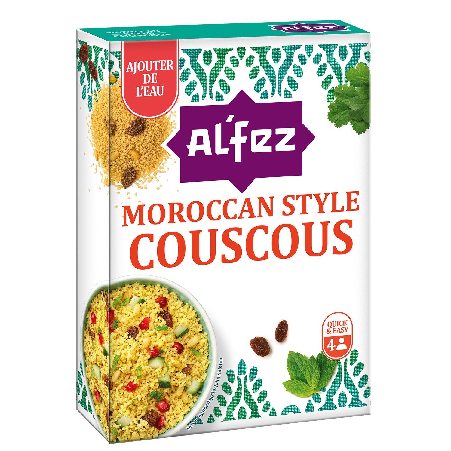 Al'Fez Couscous aux épices marocaines Mélange gourmand de grains dorés, de raisins secs, de pignons de pin et d'épices, le couscous aux épices marocaines Al'Fez accompagne de façon savoureuse vos tajines, plats de viandes et de légumes.
